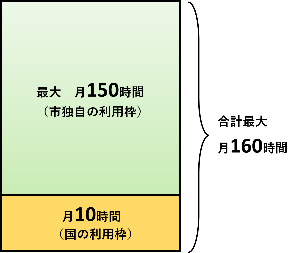 国が定める定める全国で利用可能な月10時間の利用枠に加え、市独自の利用枠の上乗せを行い、お子さん1人につき、最大で月160時間まで利用可能となります。